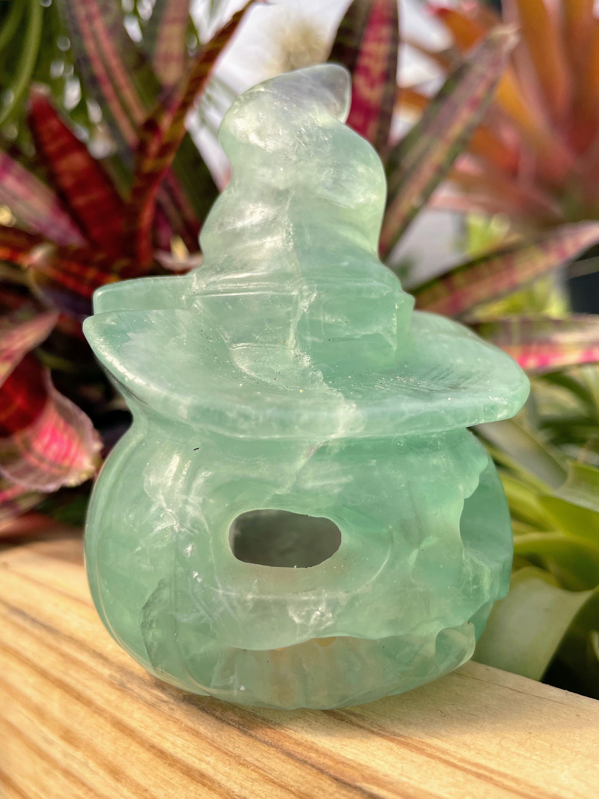 Purple Fluorite, Zebra Calcite or Orange Calcite crystal jack-o'-lantern witch carving The perfect gift for that crystal loving friend (or yourself)! Great for adding to your planters, displaying around plants, or displaying around your home. Includes 1 crystal jack-o'-lantern witch carvingSize: Approx. ...
